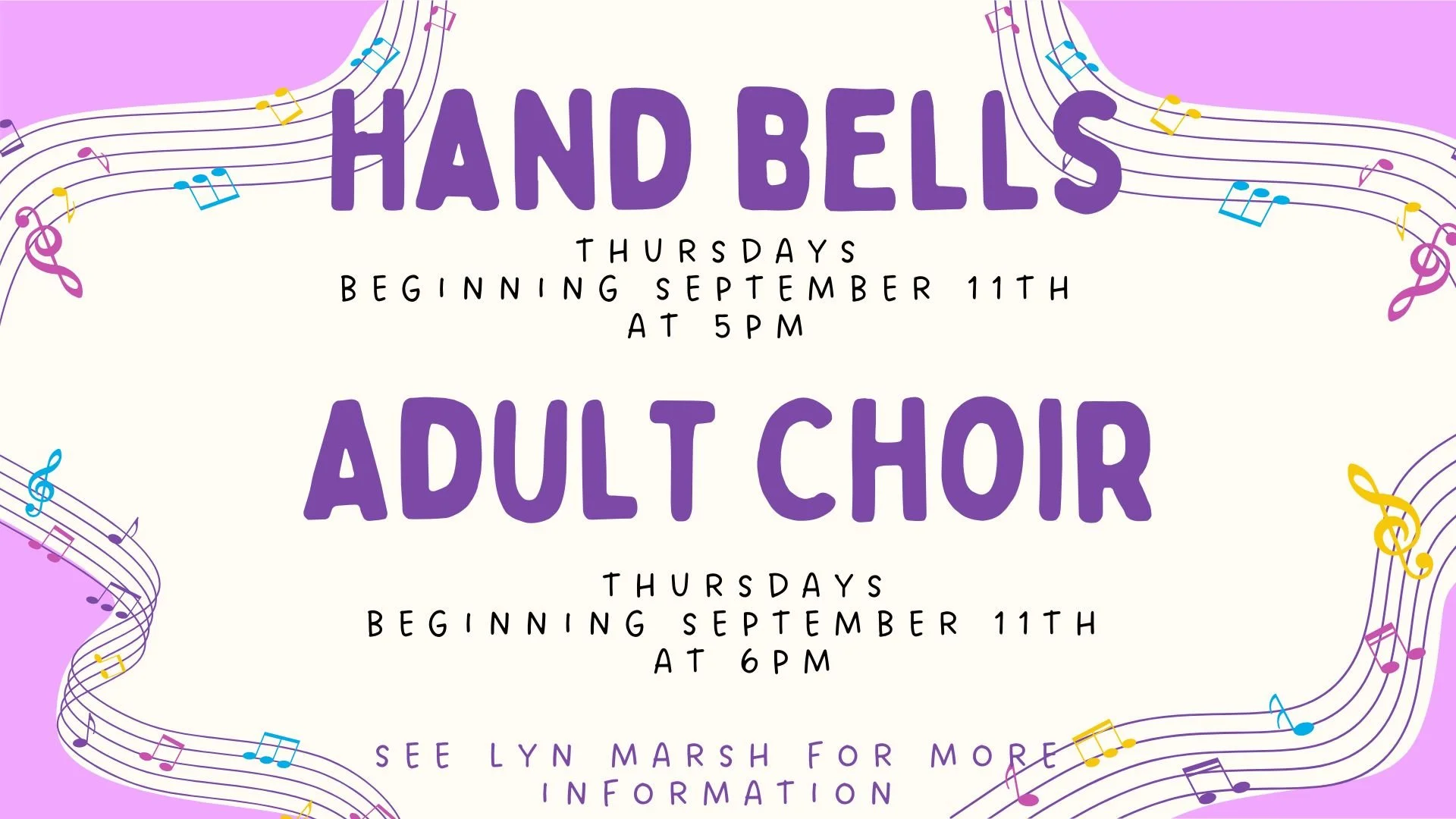 Adult Choir and Handbells Thursday, September 11, 2025 5:00 PM 17:00 Thursday, May 28, 2026 7:00 PM 19:00 Grove City Grace UMC 210 S. Broad Street Grove City, Pa. 16127 United States (map) Google Calendar ICS