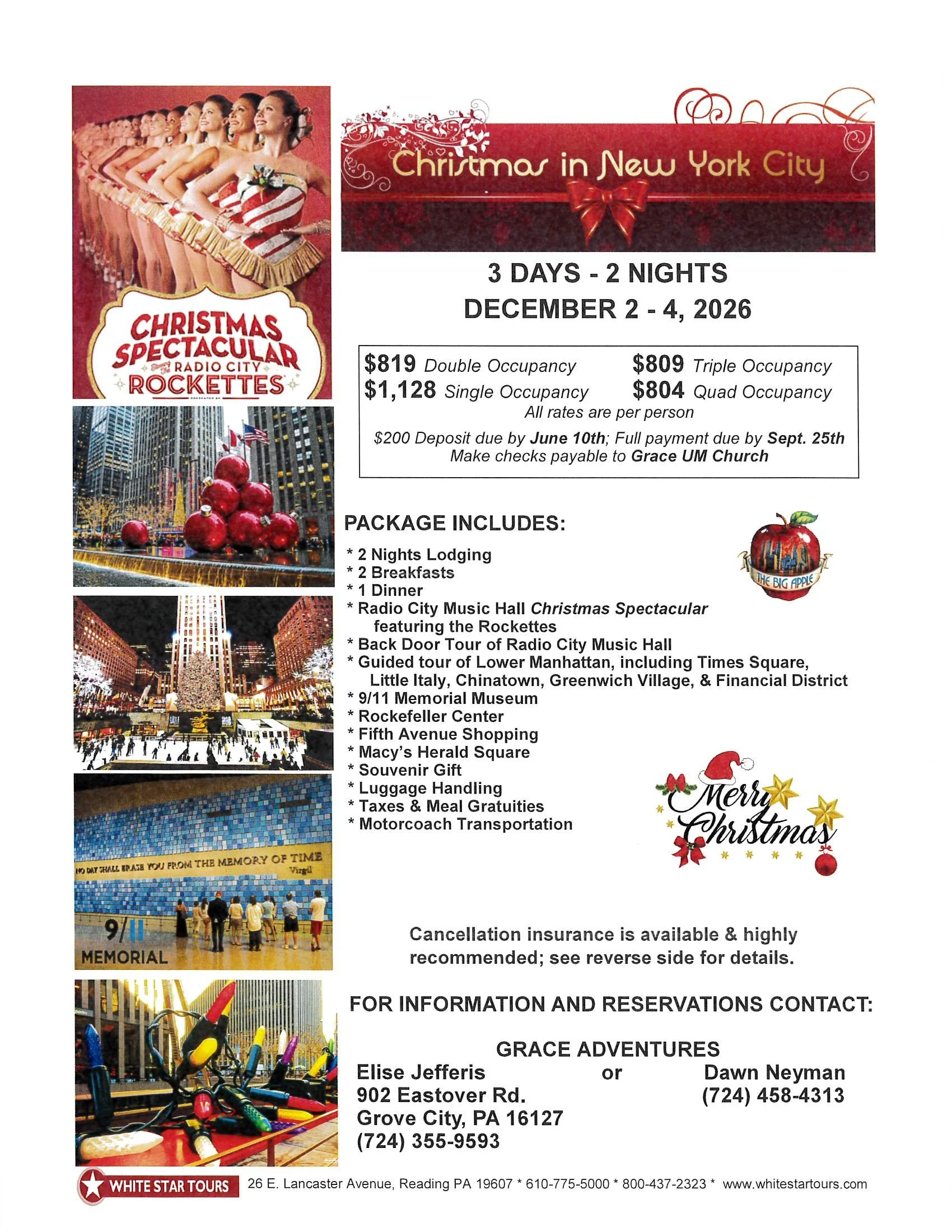 Grace Adventures Bus Trip to NYC Wednesday, December 2, 2026 7:00 AM 07:00 Friday, December 4, 2026 8:00 PM 20:00 Grove City Grace UMC 210 S. Broad Street Grove City, Pa. 16127 United States (map) Google Calendar ICS